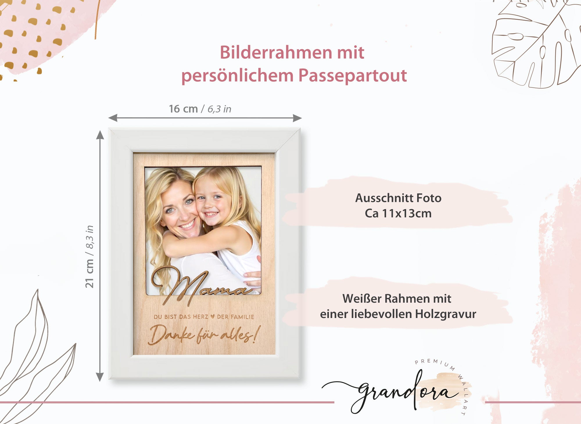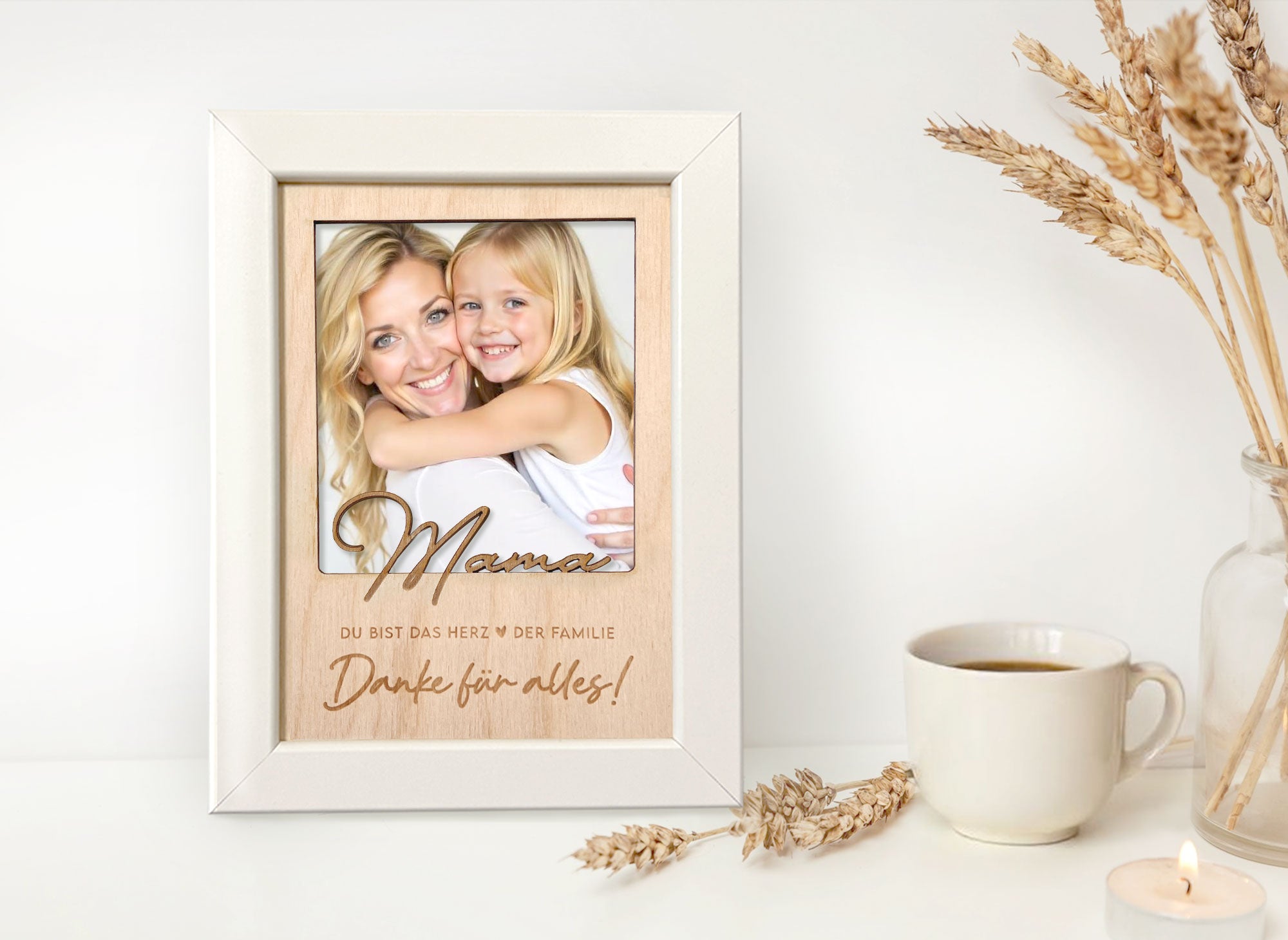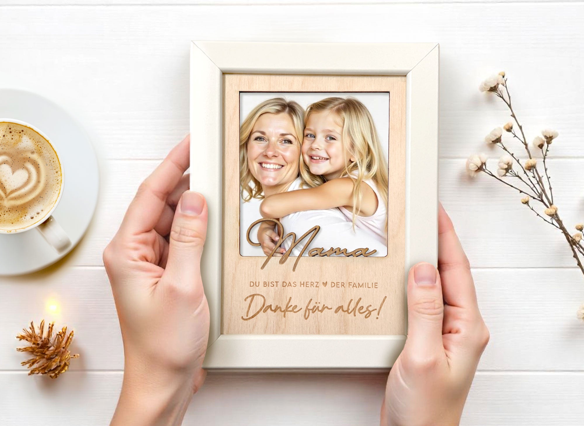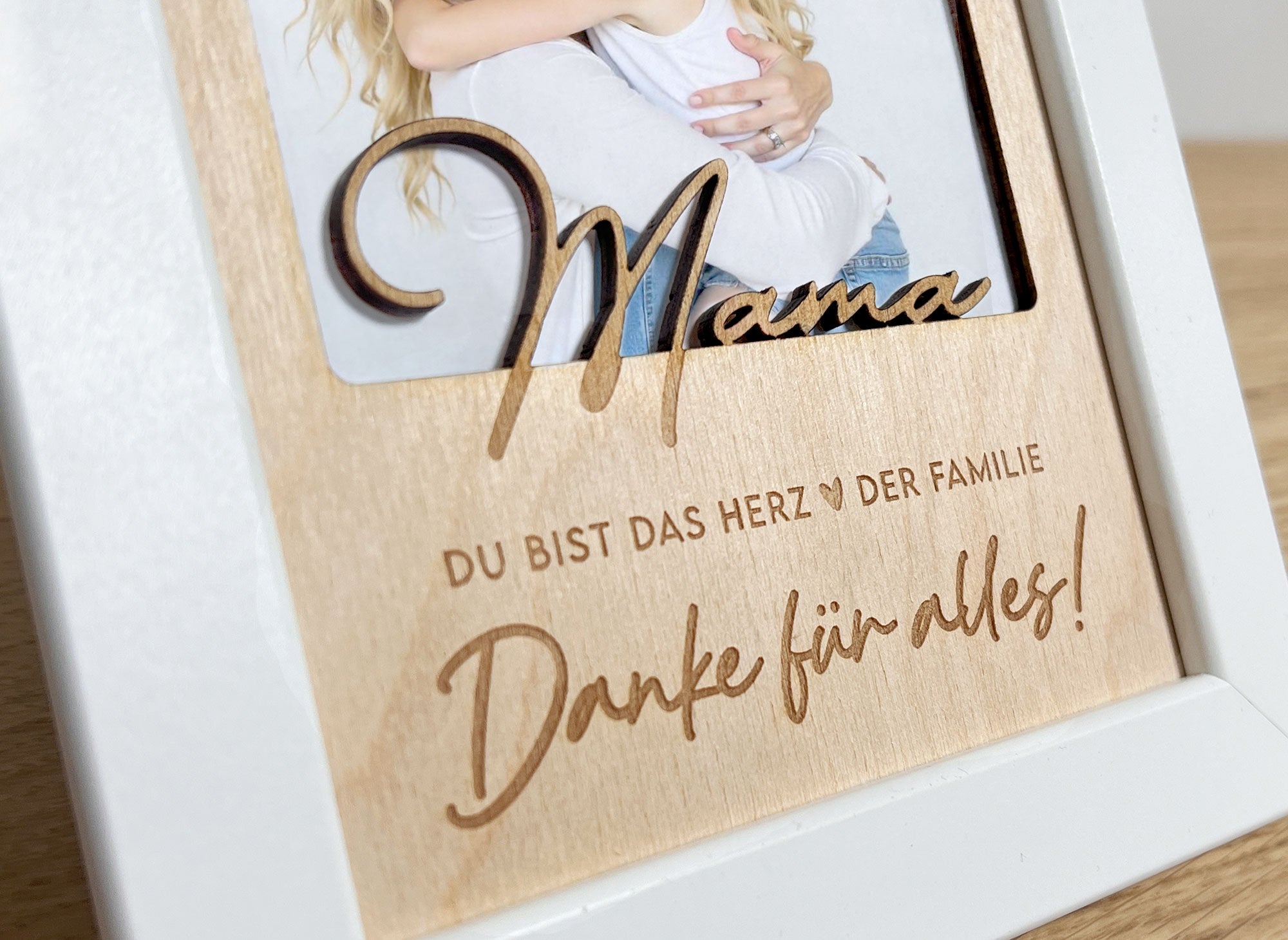 Unser handgefertigter Bilderrahmen kombiniert einen eleganten weißen Rahmen mit einer liebevollen Holzgravur.