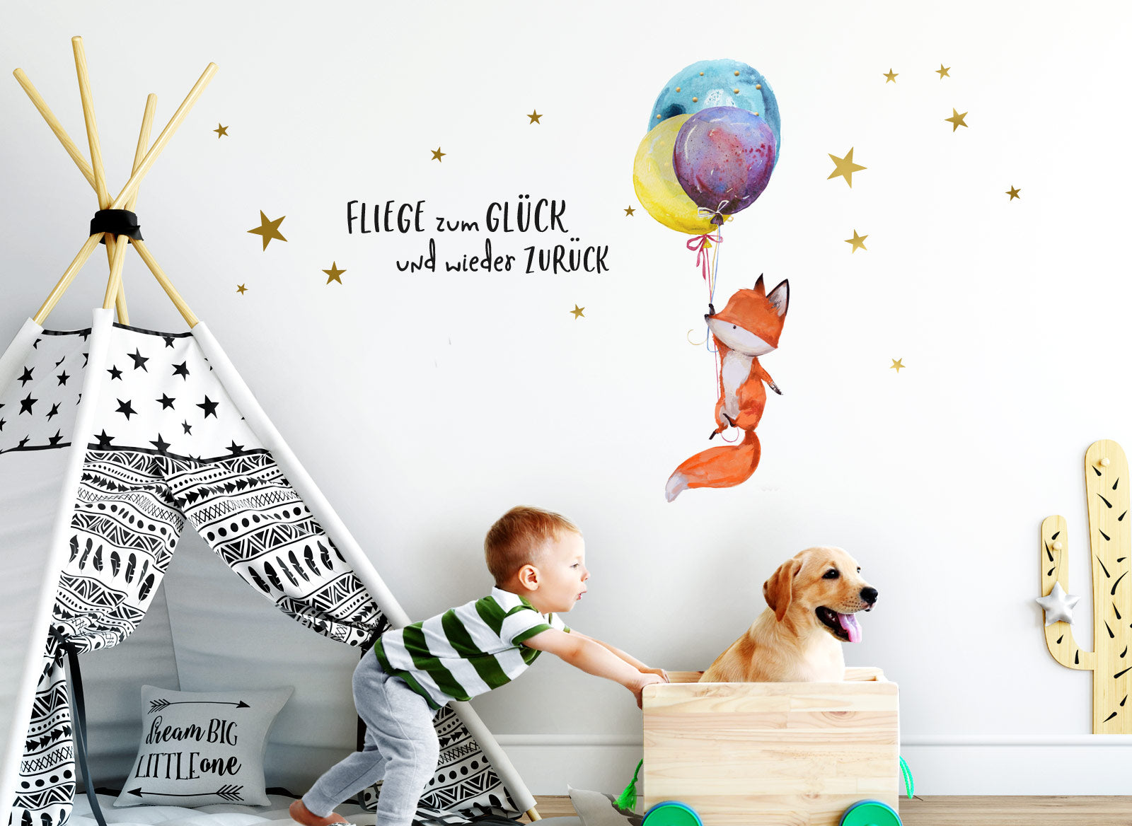 Wandsticker Fuchs mit Ballons und Spruch Fliege zum Glück