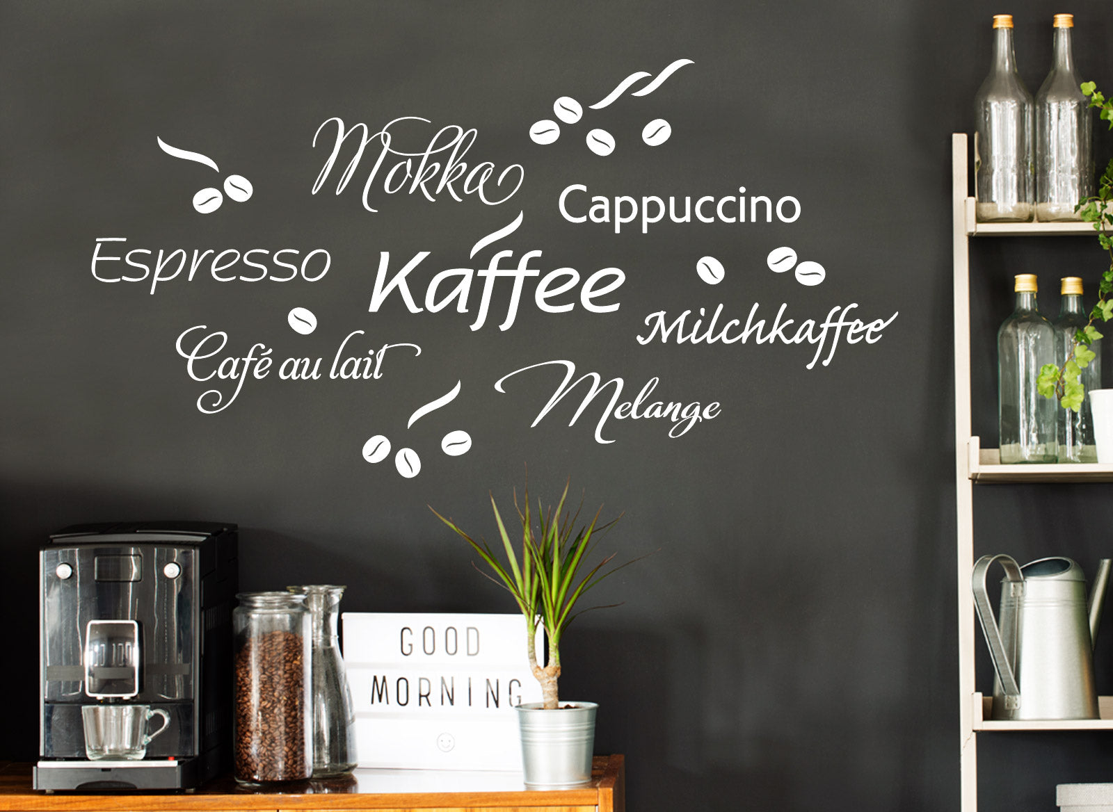 Unser Wandtattoo mit Kaffeemotiven macht die Küche freundlicher und lädt zum Verweilen und Entspannen ein.