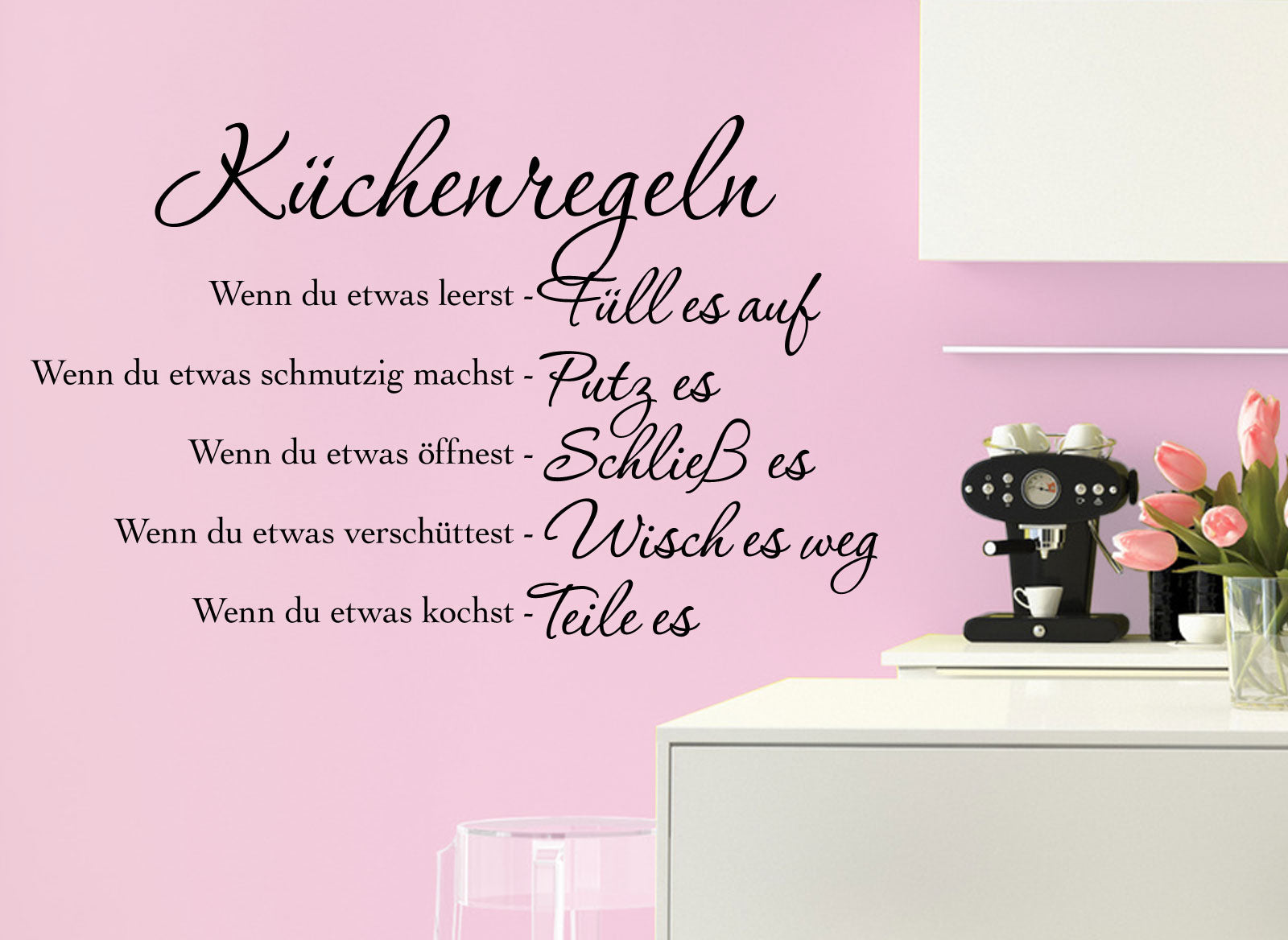 Am schönsten ist die heimische Küche, wenn sich jeder an ein paar Regeln hält. Mit diesem Wandtattoo müssen Sie nicht immer jedem Ihrer Familienmitglieder verbal auf die Hände klatschen, sondern visualisieren die Küchenregeln durch einen lustigen Spruch. Die abwechselnde Schrift sorgt hierbei für ein besonders schönes Ambiente. Sie können die Farbe und Größe des Spruchs individuell wählen. So können Sie auch in kleinen Küchen an die wichtigsten Regeln spielend leicht erinnern.Dieses Motiv bieten wir Ihnen in den Größen (B x H):