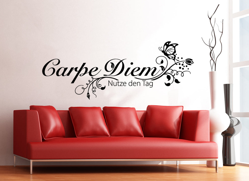 Der motivierende Spruch "Carpe Diem Nutze den Tag" ist bei uns als selbstklebendes Wandtattoo erhältlich,