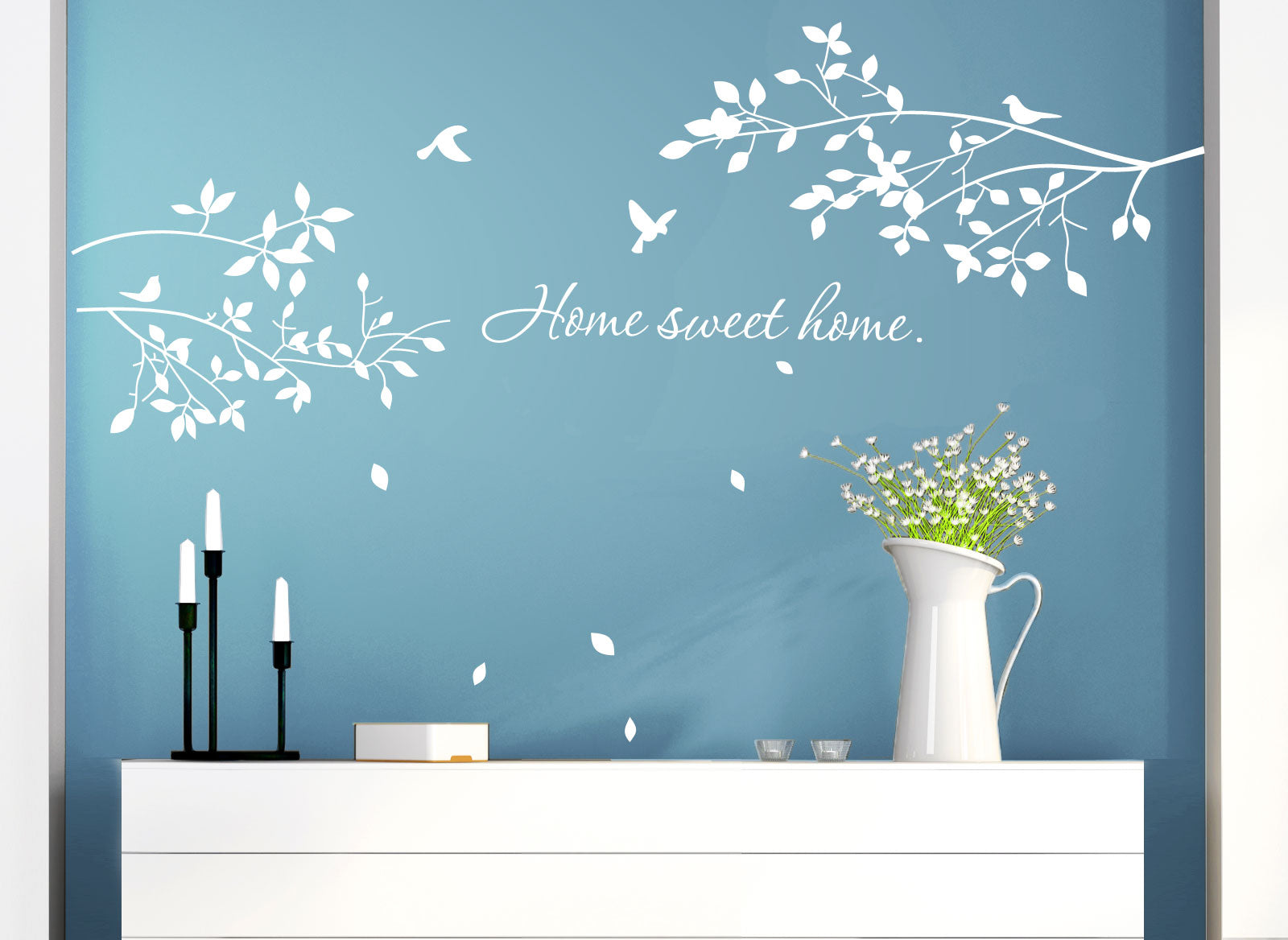 Das selbstklebende Kunstwerk Äste mit Vögeln stellt das Zitat "Home sweet home" an Ihrer Wand im Wohnzimmer oder Flur dar.
