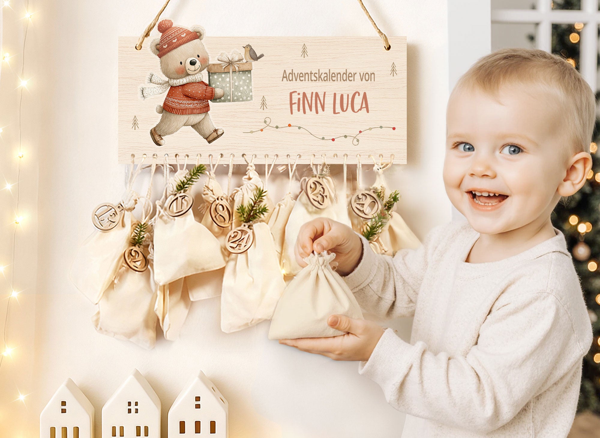 🎄 Personalisierter Adventskalender zum Selberbefüllen mit Wunschnamen, Baumwollsäckchen und 24 Zahlenanhänger aus Holz 🎄