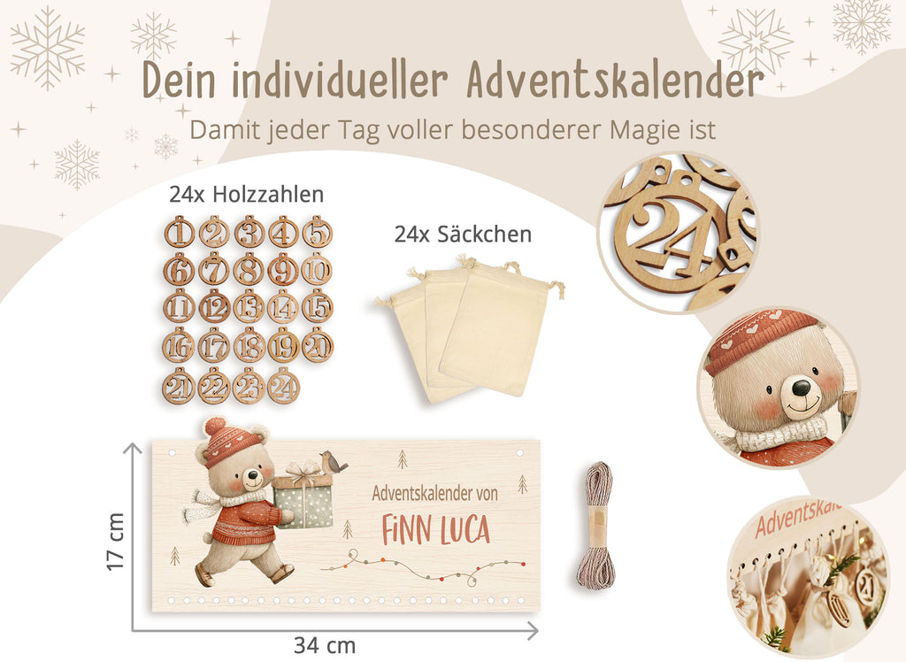 • Adventskalender: 34 x 22 cm, aus Buchenholz mit Wunschname
