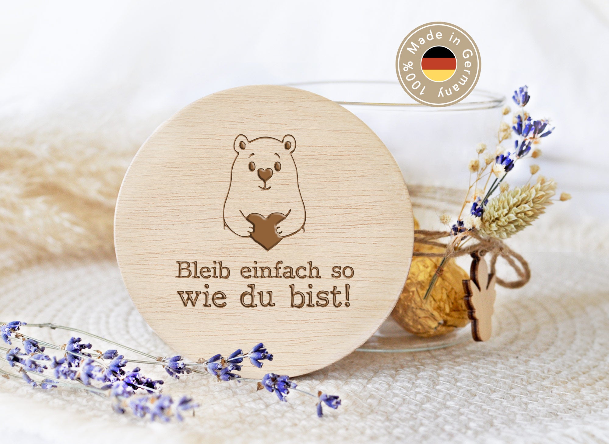 • Hochwertige Lasergravur mit dem Spruch: "Bleib einfach so wie du bist!"