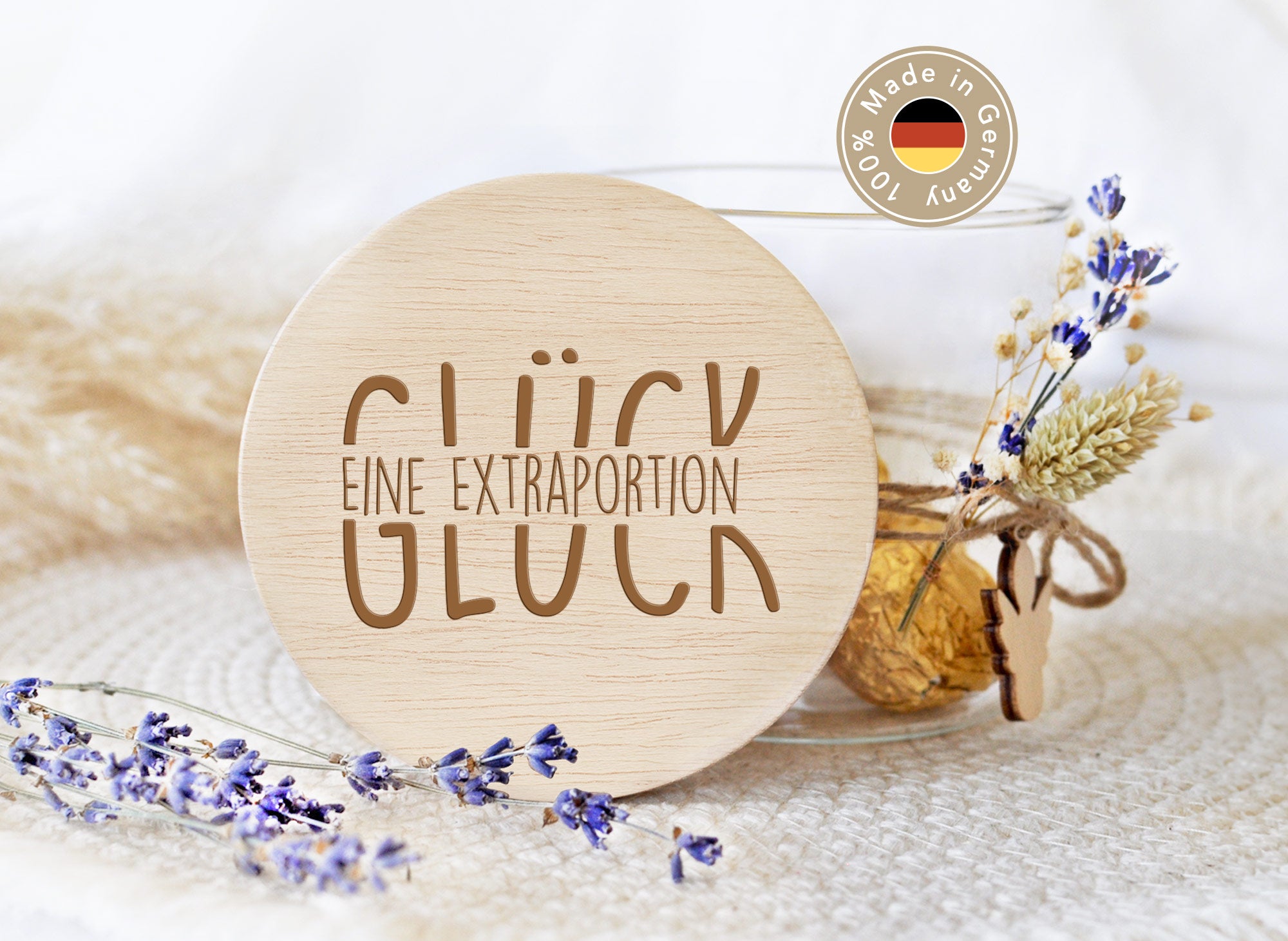 - Hochwertige Lasergravur mit dem Spruch: "Eine Extraportion Glück"