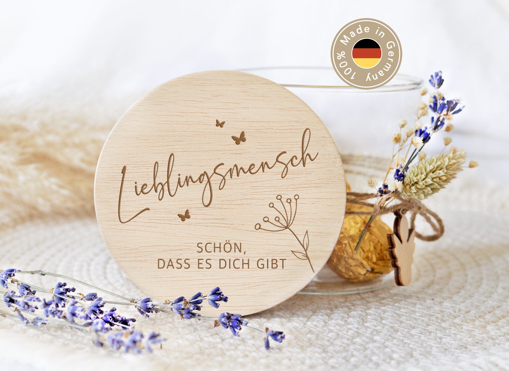 - Hochwertige Lasergravur mit dem Spruch: "Lieblingsmensch schön, dass es dich gibt"
