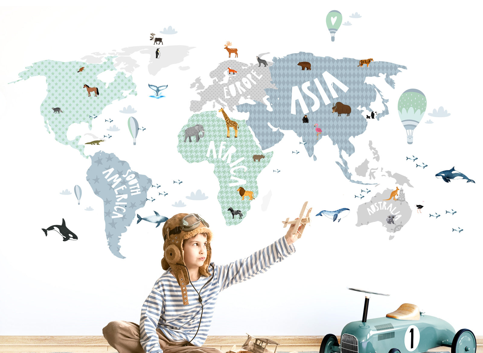 Little Deco Wall sticker world map with animals gray blue green DL130
