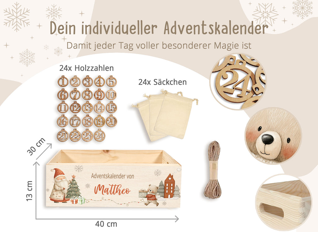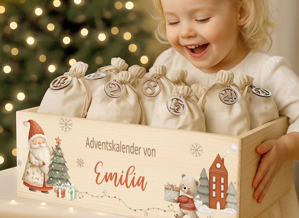 Manchmal ist es nur ein Augenblick wunderschöner Vorfreude, wenn kleine Finger ein Säckchen voller Erwartung öffnen, ein Lächeln, das den Raum heller macht und morgen ist schon wieder ein Türchen dran. Unsere personalisierte Adventskiste trägt euren Wunschnamen und begleitet euch durch vierundzwanzig Tage voller kleiner Freuden.