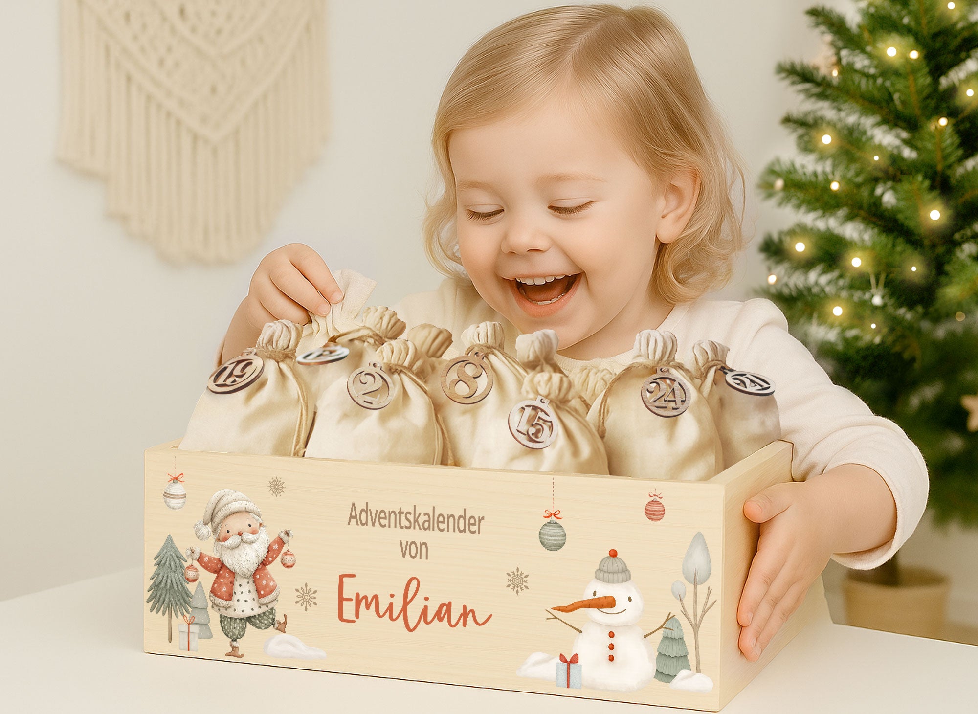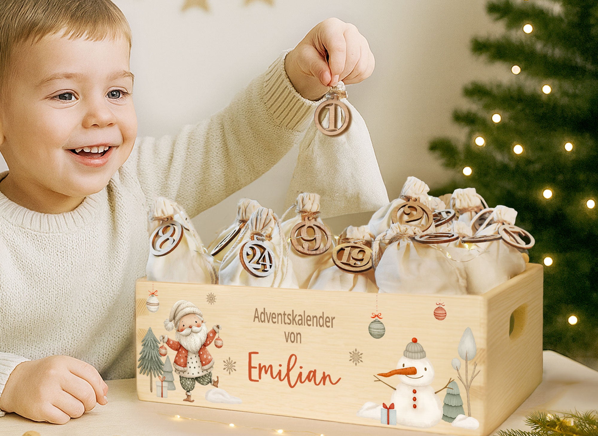 Manchmal ist es nur ein Augenblick wunderschöner Vorfreude, wenn kleine Finger ein Säckchen voller Erwartung öffnen, ein Lächeln, das den Raum heller macht und morgen ist schon wieder ein Türchen dran. Unsere personalisierte Adventskiste trägt euren Wunschnamen und begleitet euch durch vierundzwanzig Tage voller kleiner Freuden.