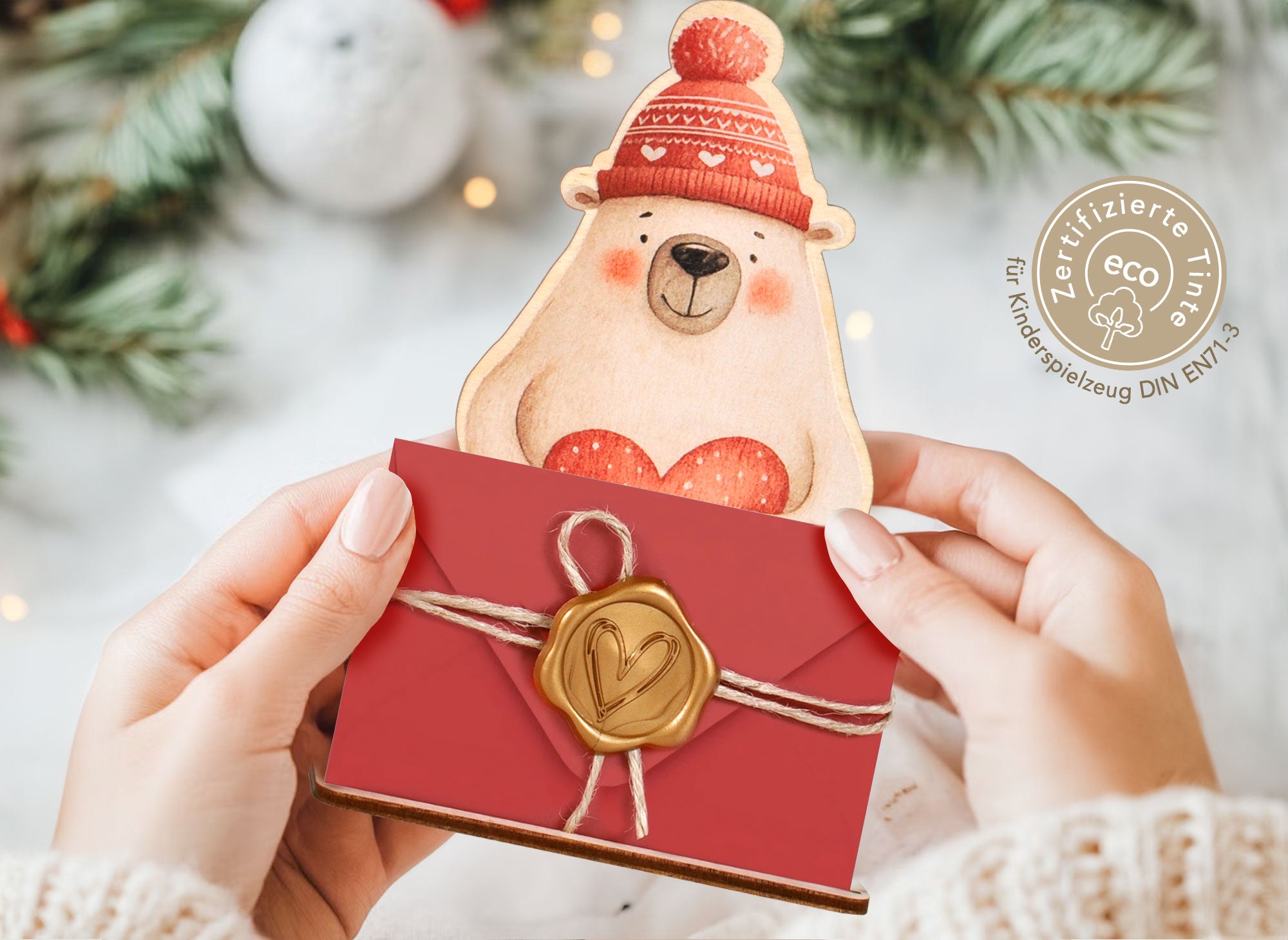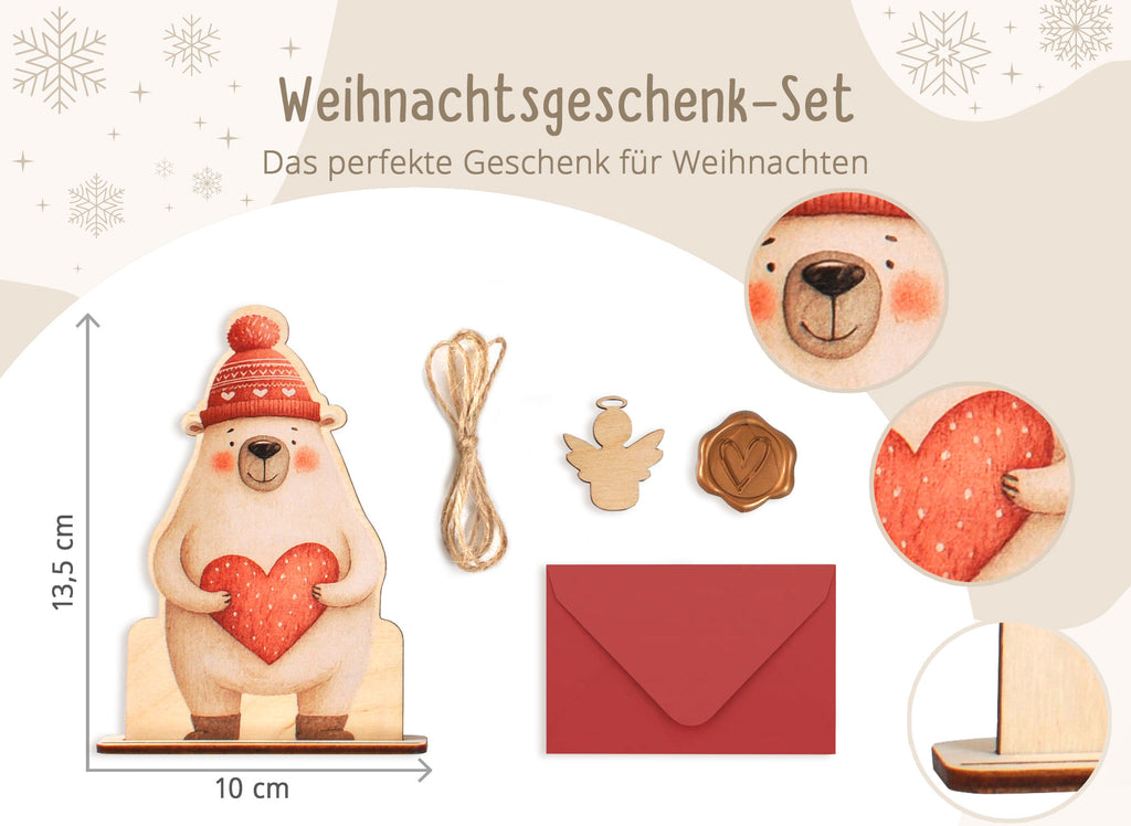 In unserem Weihnachts Geschenkset bekommst du unseren handgefertigten Bär mit Herz aus Holz in einer wunderschönen Geschenkbox, liebevoll arrangiert mit einem roten Umschlag, einem stilvollen Wachssiegel und ergänzt durch einen Engel Anhänger aus Holz. Alles wird von uns in unserem Familienbetrieb in der Nähe von Berlin von Hand für dich gefertigt.