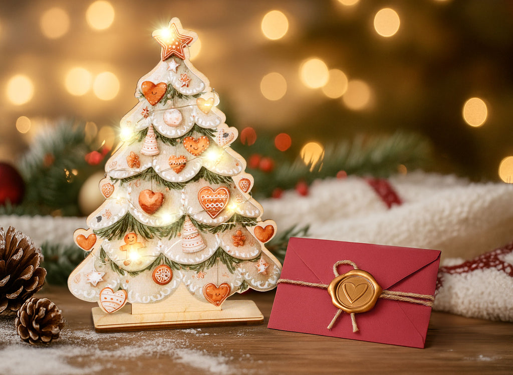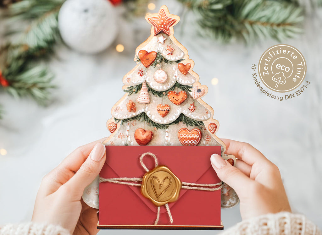 In unserem Weihnachts Geschenkset bekommst du unseren handgefertigten Weihnachtsbaum aus Holz in einer wunderschönen Geschenkbox, liebevoll arrangiert mit einem roten Umschlag, einem stilvollen Wachssiegel und ergänzt durch einen Engel Anhänger aus Holz. Alles wird von uns in unserem Familienbetrieb in der Nähe von Berlin von Hand für dich gefertigt.