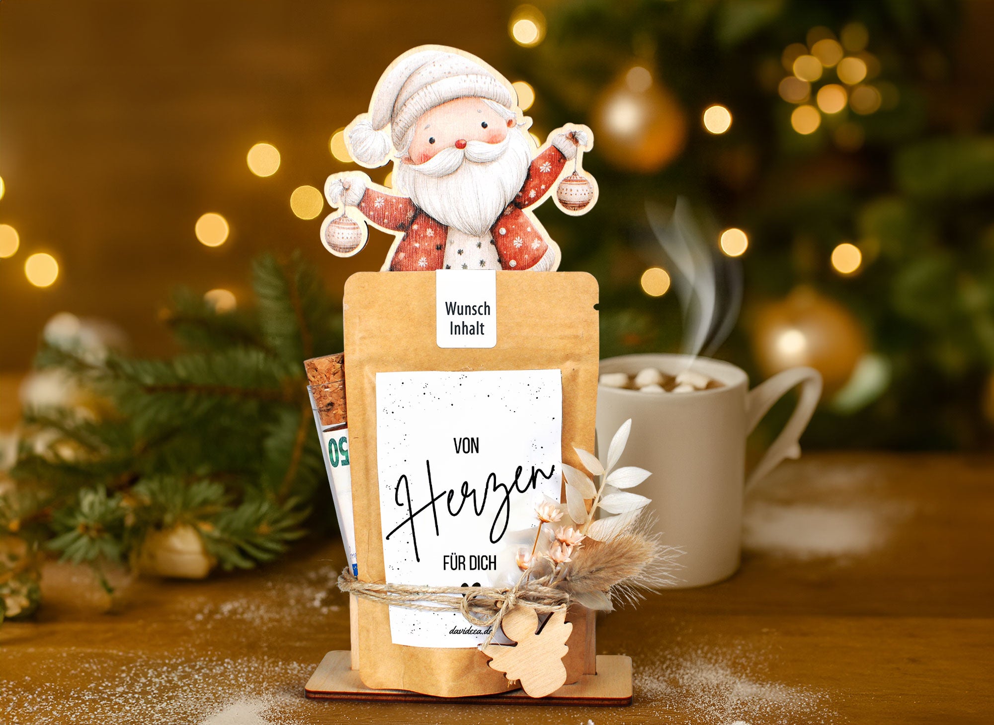 Manchmal sind es die kleinen Geschenke, die die größte Freude bereiten. Unser liebevoll gestaltetes Set ist das perfekte Weihnachtsgeschenk, als festliche Tischdeko, als kleines Wichtel- oder Nikolausgeschenk, als Geldgeschenk oder einfach als herzliche Aufmerksamkeit zwischendurch. Mit diesem Weihnachten Geschenkset verschenkst du nicht einfach nur eine Kleinigkeit, sondern ein echtes Unikat, das es so kein zweites Mal gibt. Ein stimmungsvolles Deko-Stück, Genuss zum Trinken und eine Portion Wärme fürs Herz.