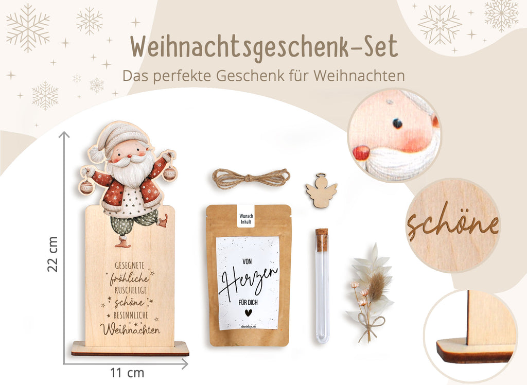In unserem Weihnachts Geschenkset bekommst du unseren handgefertigten Weihnachtsmann Holz-Aufsteller mit Spruch "Gesegnete, fröhliche, kuschelige, schöne, besinnliche Weihnachten" und Fußelement zum Hinstellen, liebevoll arrangiert mit einer Winterzauber-Tüte deiner Wahl, einem Reagenzglas mit Korken, einem kleinen Trockenblumen-Sträußchen, einer Jutekordel und einem Engel Anhänger. Alles wird von uns in unserem Familienbetrieb in der Nähe von Berlin von Hand für dich gefertigt.