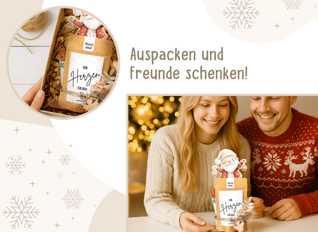 Ob für Familie oder Freunde als Weihnachtsgeschenk, Wichtelgeschenk oder als kleines Nikolausgeschenk. Mit diesem besonderen Geschenkset zauberst du im Handumdrehen ein Lächeln ins Gesicht deiner Liebsten.