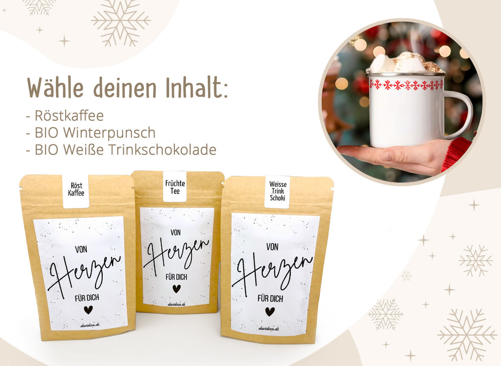 • 1 Genuss-Tüte nach Wahl: Bio Winterpunsch (Früchtetee) / Bio Weiße Trinkschokolade / Röstkaffee (gemahlen, mittlere Stärke) 15 g