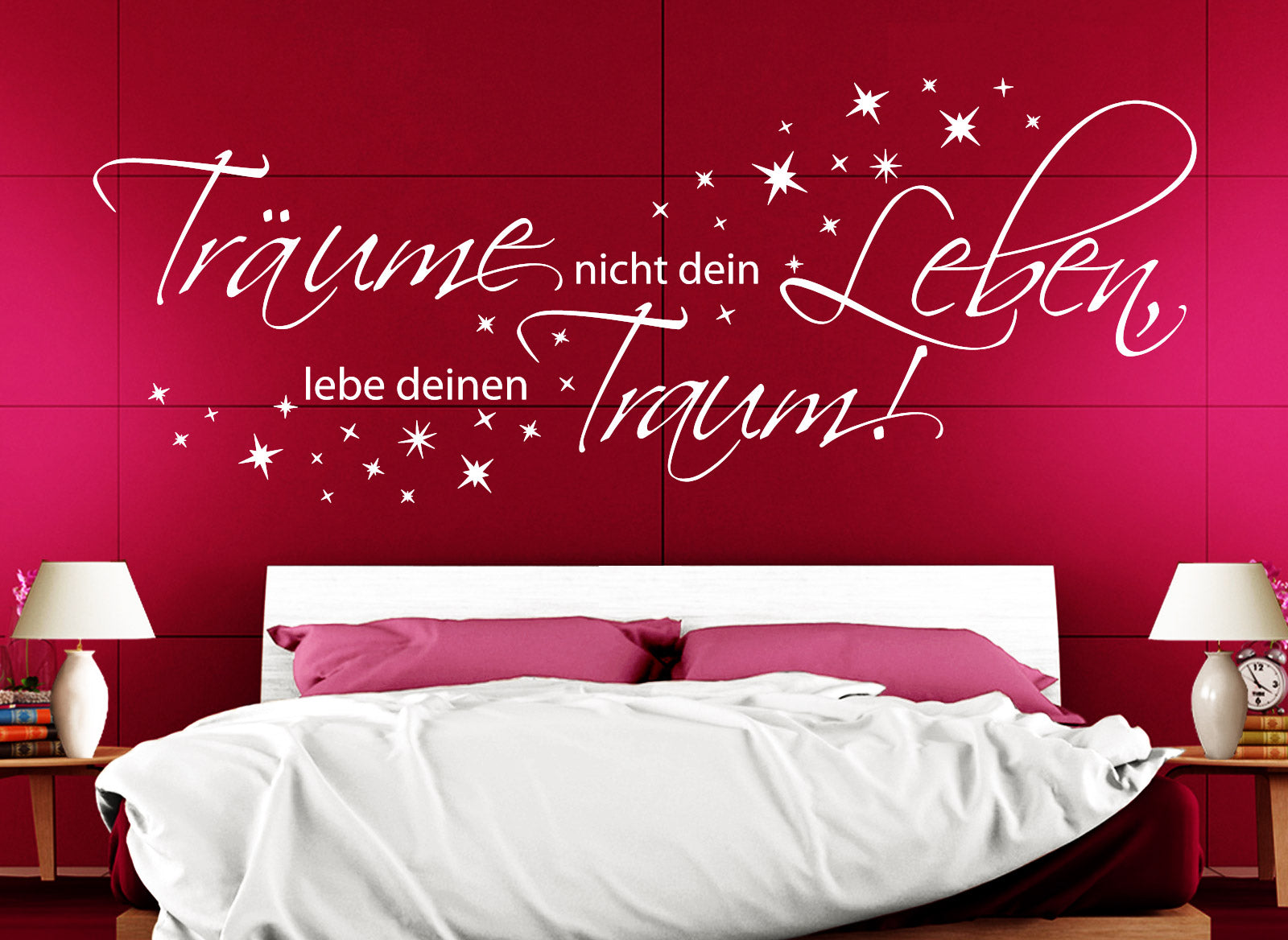 Manchmal ist es an der Zeit, spontan Dinge anzupacken. Das Wandtattoo fordert explizit dazu auf, über sich hinauszuwachsen und sich auch Neues zuzutrauen, wenn damit Träume erfüllt werden. Begleitet wird der Schriftzug von einer großen Anzahl von Sternen - denn was aus den verwirklichten Träumen später wirklich wird, steht in den Sternen. Deswegen ist es vielleicht auch für Sie eine Option, manchmal kleinere Wagnisse einzugehen und auszuprobieren.